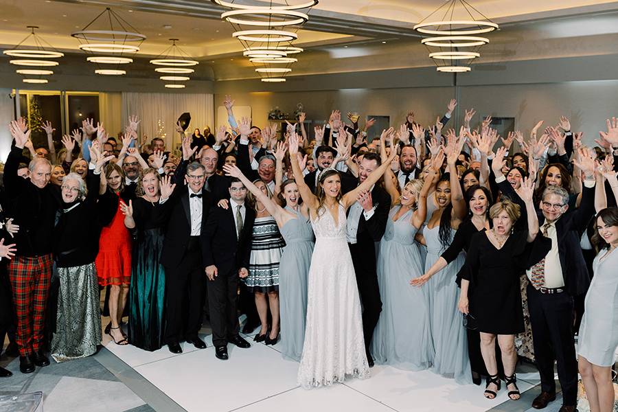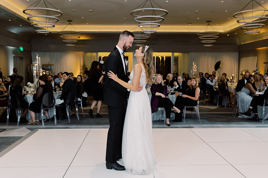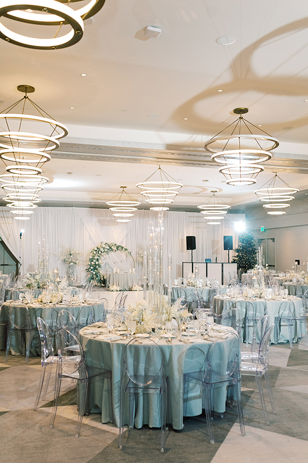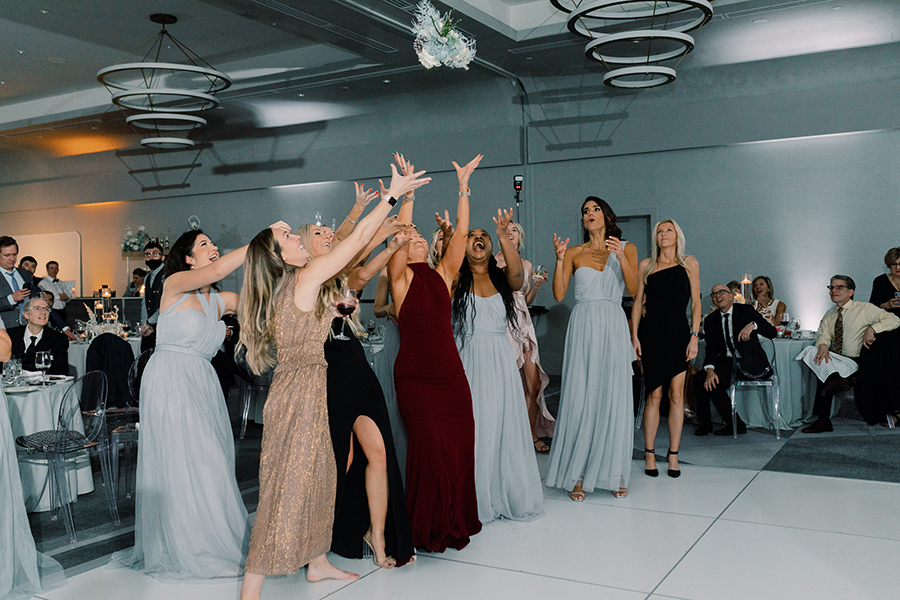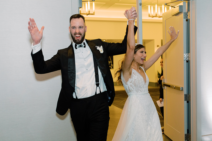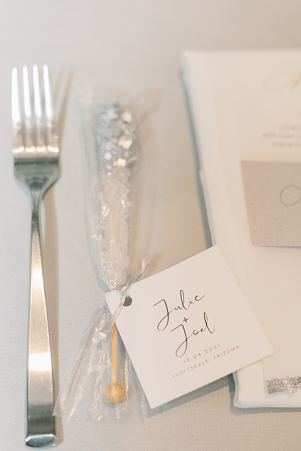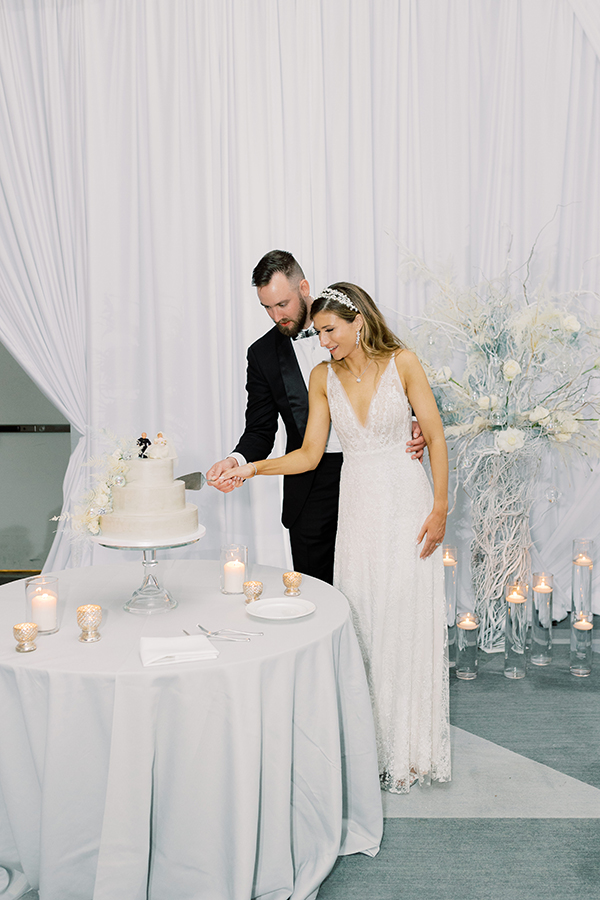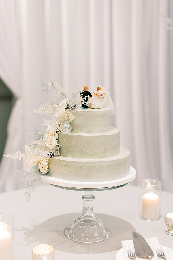3. Describe the theme or color scheme of your wedding, and what you chose for your table setting at the reception: When me and Joel entered into the reception it was our first time seeing everything all decorated after getting married. The color scheme was gray and silver and almost embodied a magical whimsical Christmas winter forest. There were two lit up Christmas trees on either side of our sweetheart table, and our arch from our ceremony brought into the back of our sweetheart table. Sitting with each other at our sweetheart table was one our favorite moments of our reception because we had the connected feel of being with our guests, but also the intimacy of having our own table connecting just shortly after we had tied the knot. Our wedding arch was stationed right behind our sweetheart table. It was a circular shape covered in green ferns white roses and a few white ornaments to give that joy of holiday and Christmas cheer. I’ll never forgot looking over at Joel as the nutcracker was playing in the background while enjoying my decadent lobster bisque and I said to him “Joel this is so magical I feel like I’m eating dinner in a snow globe!” It was truly so special.