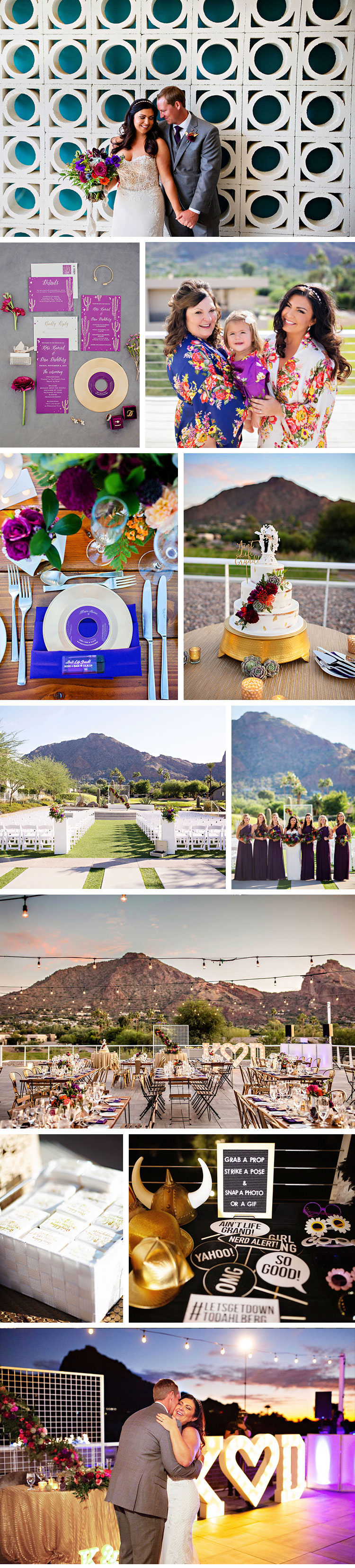 Our theme was "Ain't Life Grand!" (the title of one of our favorite Widespread Panic songs) inspired by music, Arizona sunsets and modern-rustic design. Our palette was made up of sunset jewel tones with deep purple/plum as the primary color along with pops of gold.